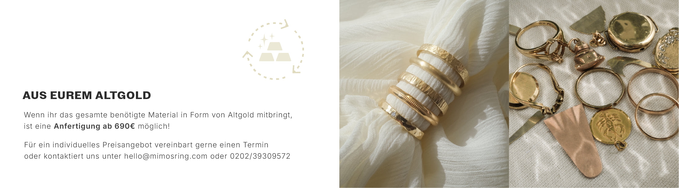 Bei uns steht Nachhaltigkeit an erster Stelle – alle unsere Produkte bestehen aus recyceltem Echtgold. Die handgefertigten Eheringe, tragen nicht nur eine einzigartige Geschichte, sondern auch einen Beitrag zum Umweltschutz bei.