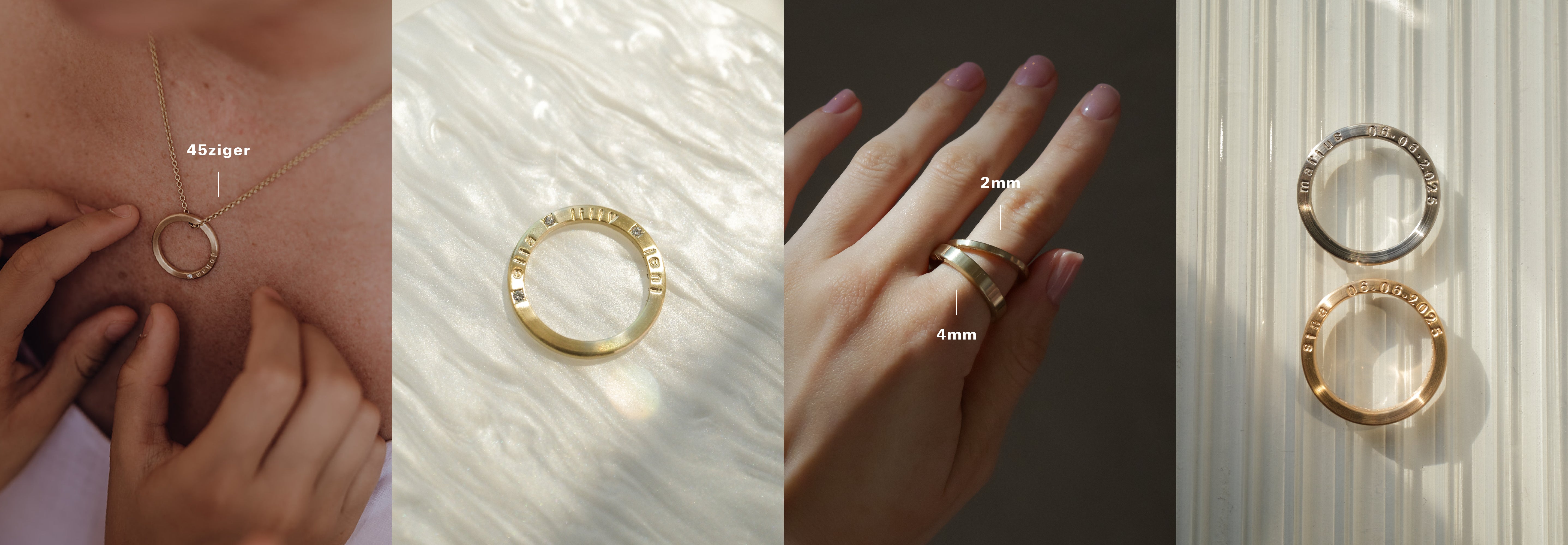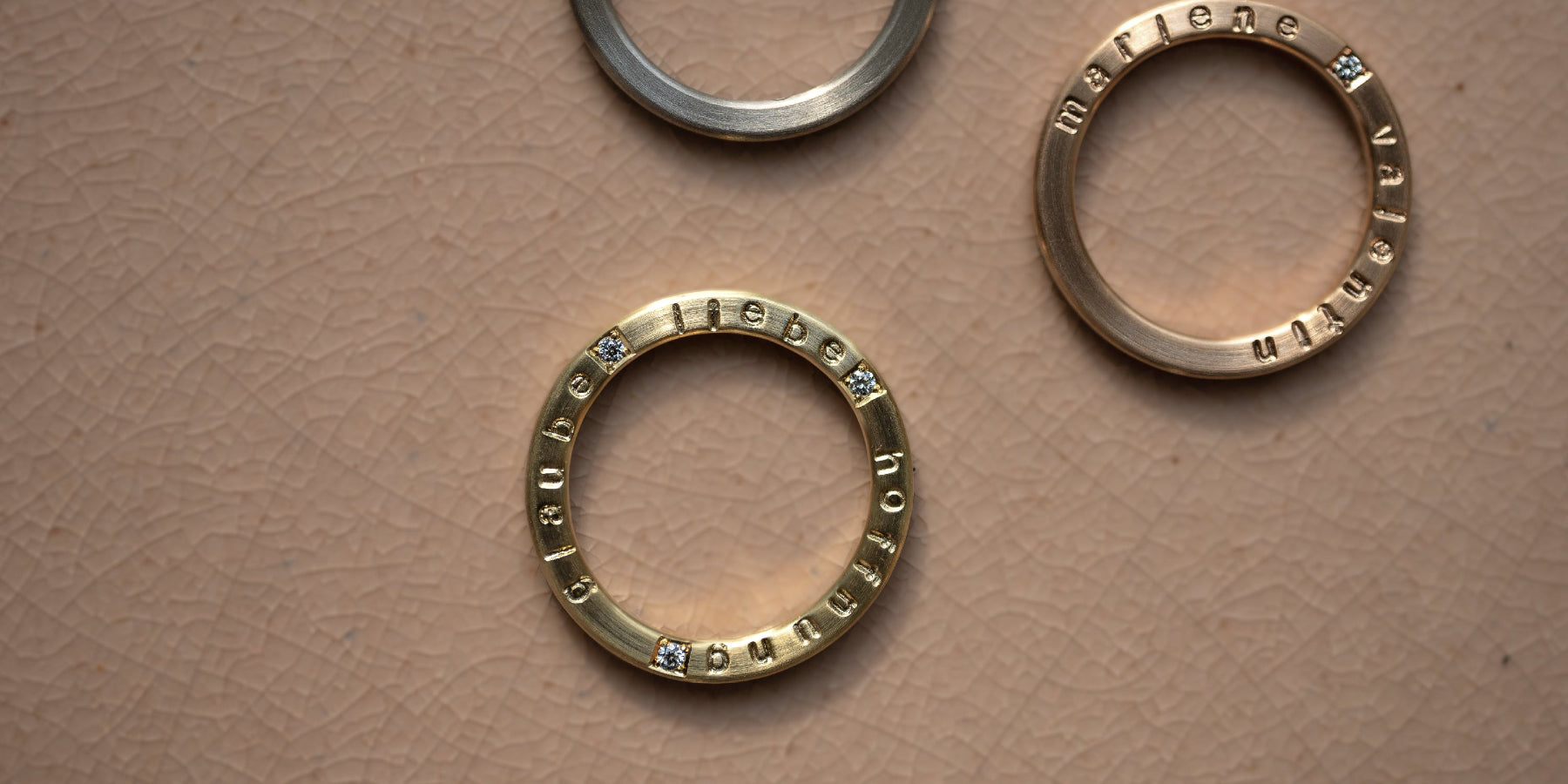 Entstanden ist ein einzigartiges handwerkliches Stempelverfahren. Die Abstände zwischen den einzelnen Buchstaben können unterschiedlich sein, denn genau das macht unser MIMOS-Design aus. Jeder MIMOS-Ring und MIMOS-Trauring wird durch seine Punzierung zu einem absoluten Unikat!