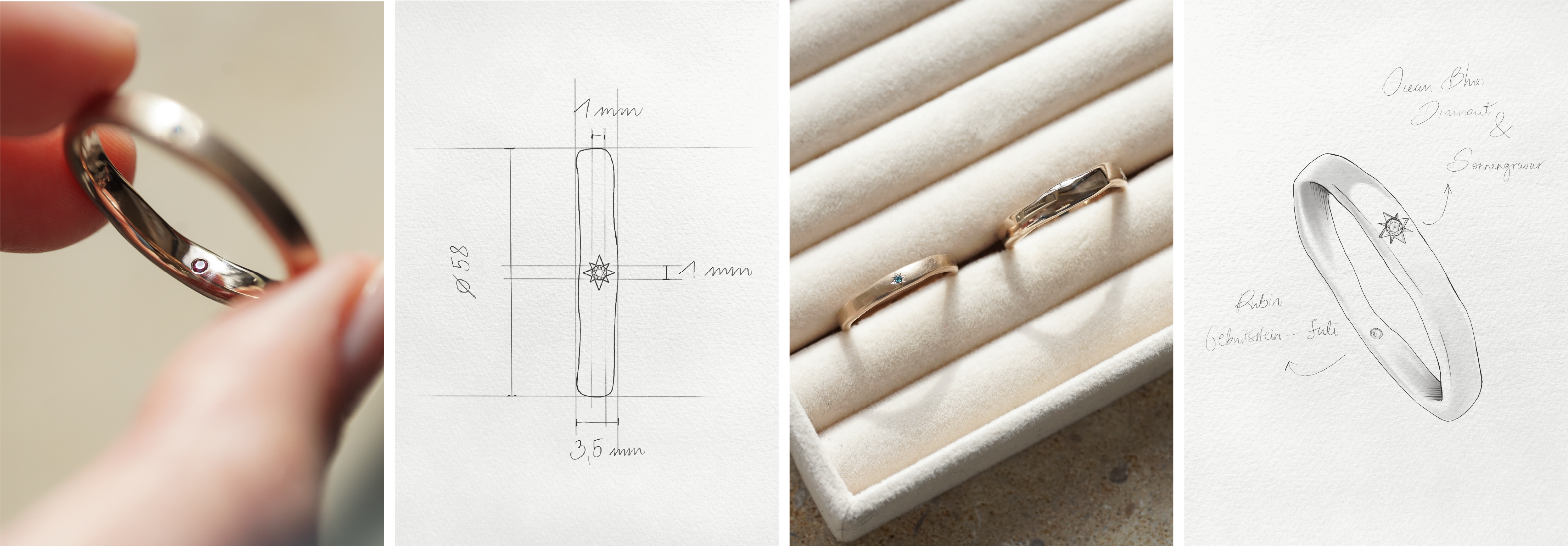 Ihr habt eine längere Anreise und könnt uns nicht vor Ort besuchen? Auch hierbei unterstützen wir euch. Per Telefon, Zoom oder Email tauschen wir Ideen und Zeichnungen aus, bis wir alle Details für eure Trauringe zusammen haben.